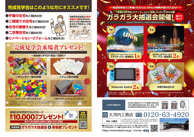家づくりをお考えの方で、WEB予約のうえ初めてご来場くださった方に5,000円分、次回家づくり相談会のご予約をされた方に、さらに5,000円分のクオカードをプレゼントいたします。