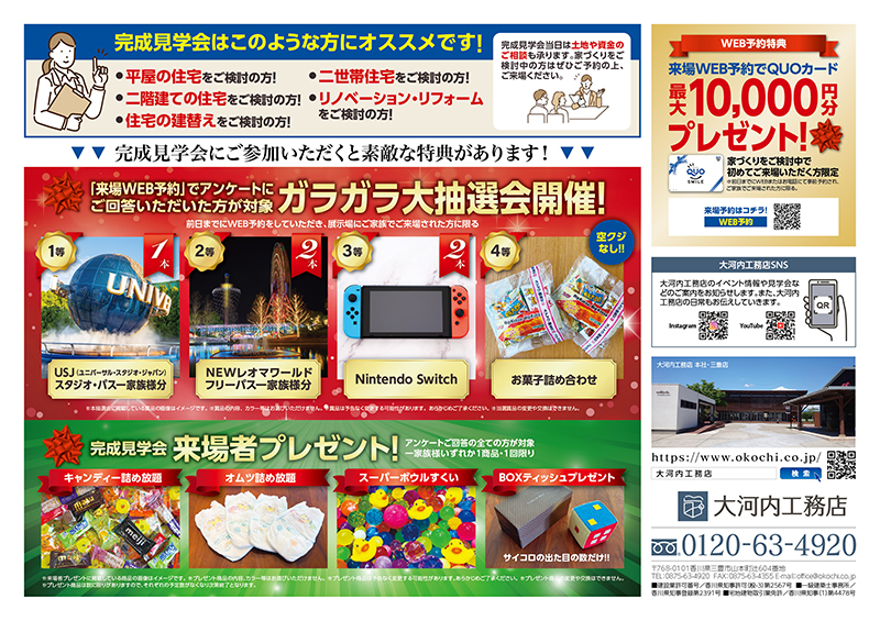家づくりをお考えの方で、WEB予約のうえ初めてご来場くださった方に5,000円分、次回家づくり相談会のご予約をされた方に、さらに5,000円分のクオカードをプレゼントいたします。