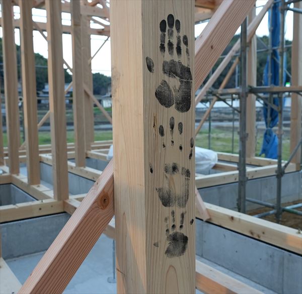 そしてその際に、記念として施主様ご家族の手形を柱に押していただきました。
