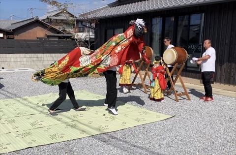 そこで、日頃から大河内工務店のお家づくりを支えてくださっている山本大工さんの自治会である黒嶋神社の田中獅子さんに、獅子舞いを行っていただきました。