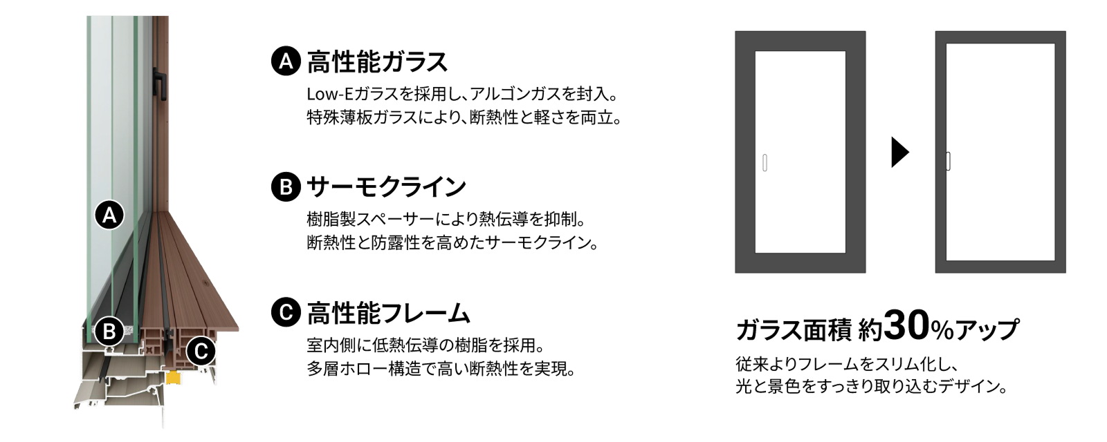 室内側に使用した「熱を通しづらい樹脂」と「高断熱ガラス」で、1年を通して快適な室内を実現。