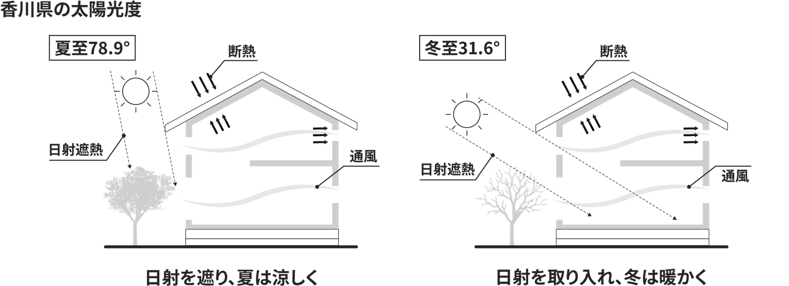 太陽の光や風の流れを計算し、自然のエネルギーを最大限に活かす設計を「パッシブデザイン」といいます。日射角度を考慮することで、夏の強い日差しを防ぎ、冬はあたたかな光を取り込むことができます。冷暖房に頼りすぎず、心地よく省エネな住環境を実現します。