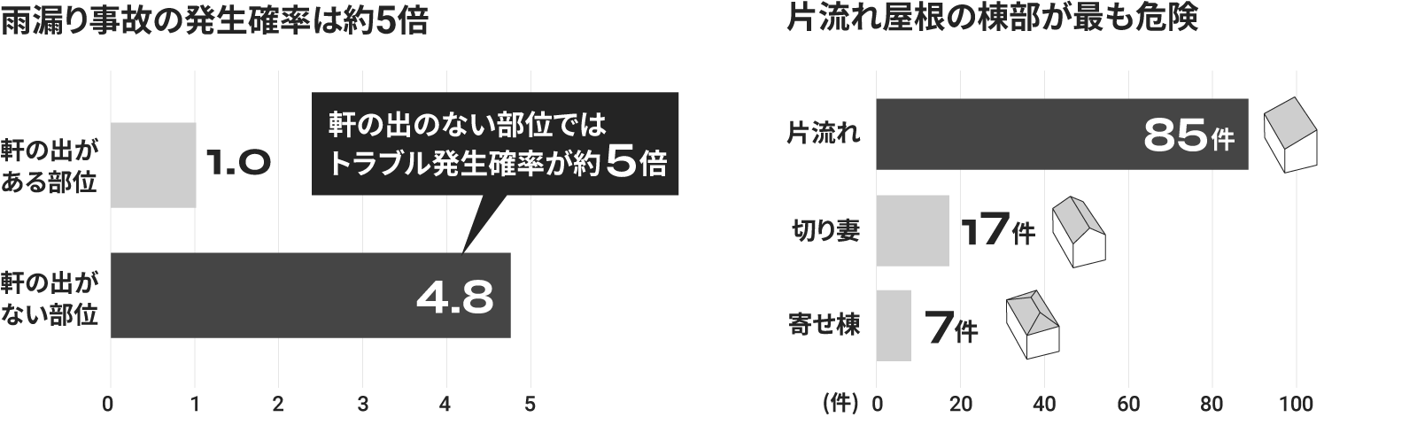 軒のない住宅は、軒ありに比べて漏水トラブルの発生率が約5倍。特に片流れ屋根の棟部分は雨水が集中しやすく注意が必要です。外観デザインは、家の寿命を左右します。