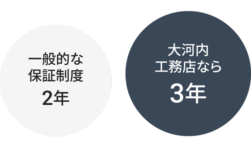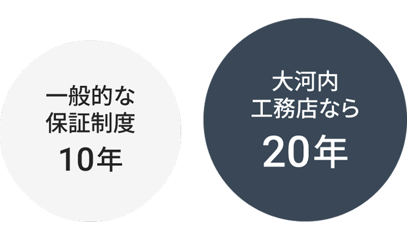 高品質な家づくりに加え、初期保証20年という長期保証で、住まいとご家族の安心を支え続けます。法律で定められた10年を超える保証は、品質への自信の証です。