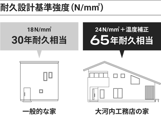 一般的な家は18N/mm²相当で約30年。大河内工務店は24N/mm²+温度補正で約65年。約2倍の耐久性を、標準仕様で実現しています。