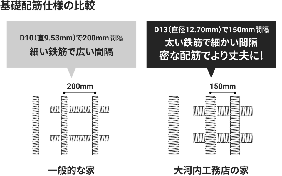一般的なD10鉄筋・200mm間隔に対し、大河内工務店ではD13鉄筋を150mm間隔で配置。鉄筋量を増やすことで、ひび割れや沈下を防ぎ、耐久性を高めています。目に見えない基礎部分だからこそ、妥協せず“強さ”にこだわっています。