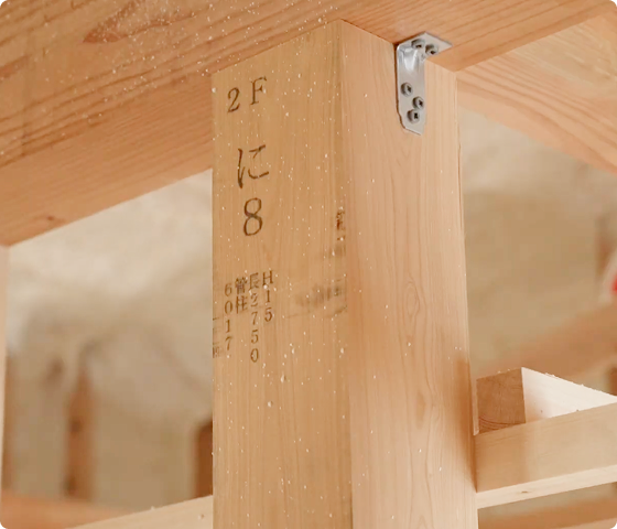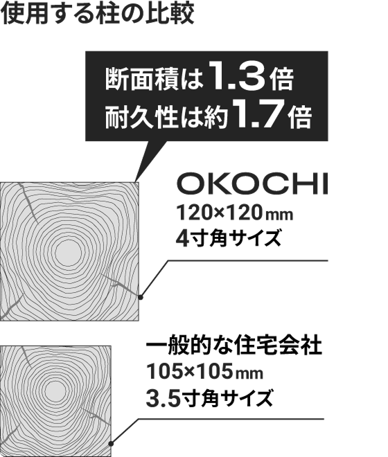耐久性を高めるために、一般的な3.5寸柱(105mm)ではなく、昔ながらの4寸柱(120mm)を標準採用。4寸柱にすることで、断面積は約1.3倍、耐久性は約1.7倍に向上します。強度計算上の差はわずかでも、25〜30年経っても反りにくく、長い年月を見据えた“長持ちする家づくり”を支えています。