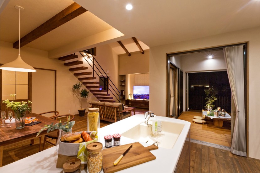 アイアンの手すり+キャンチレバー階段が空間のアクセントとなっている、ダイニングやキッチン、アウトドアリビングへとつながる一体感のある空間です。
