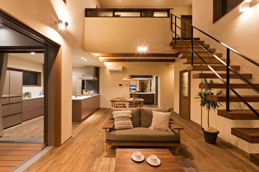 浮遊感のあるデザインが、吹抜けのリビングに軽やかな広がりをもたらします。